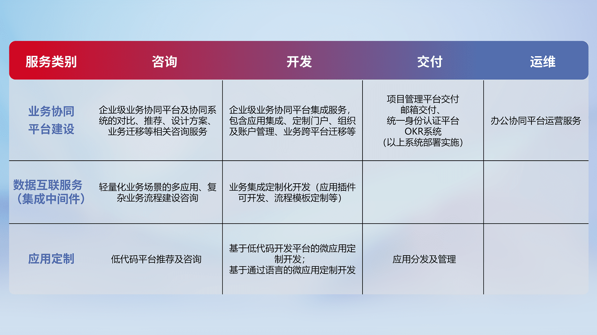 针对钉钉、、、企微、、、、IDaas等平台级产品提供产品的规划、、、方案、、、交付、、、、定制化开发等服务,,,实现如统一协同办公、、、智能客户服务、、混合会议管理、、、、智能数据查询、、等业务场景,,,实现数字化转型。。。